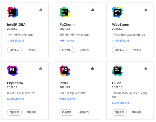아래 그림에서는 개발자들에게는 매우 유명한 IntelliJ IDEA를 포함 JetBrains사에서 서비스하고 있는 대표적인 개발자 도구를 확인하실 수 있습니다.