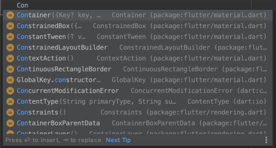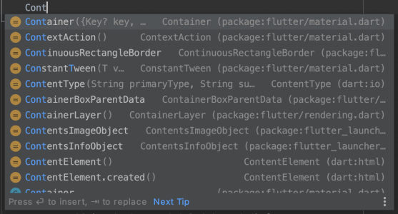 그러면 우리는 실제 코딩을 할 때, Co까지만 입력을 하고 방향키로 밑으로 6번을 내려 Container를 선택하거나, Con까지 입력하고 바로 아래를 선택하는 방식으로 간단하게 위젯을 불러올 수 있게 됩니다.